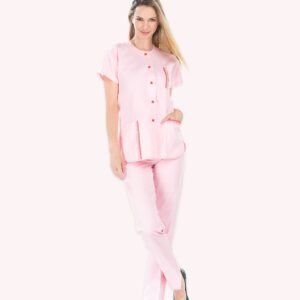 Tuniques manches courtes, fermeture latérale par pression sous patte. Rose décorative en satin. 2 poches basses, 1 poche bip, 1 poche poitrine. Fentes côtés.