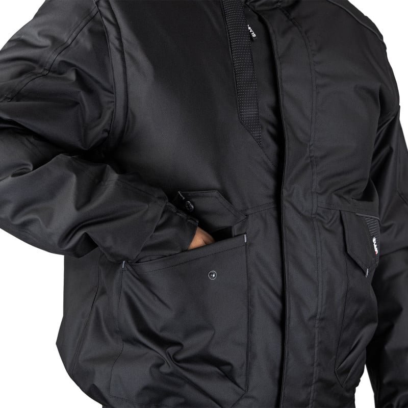 Blouson matelassé fermé par zip injecté double curseur, sous patte fermée par pressions cachées – Col montant avec protège menton – Col doublé polaire – Empiècements renforcés en Oxford 500D à la poche poitrine et aux rabats de poches basses devant – Taille élastiquée côtés et dos – Manches amovibles avec poignets semi-élastiqués – 1 poche poitrine zippée sous patte – 2 poches basses volumineuses plaquées, fermées par rabats et pressions cachées – 1 poche poitrine intérieure, fermée par bande auto agrippante – 1 zip bas du dos intérieur pour faciliter le marquage – Passepoils rétroréfléchissants aux épaules, aux poches plaquées devant et empiècement épaule dos – Coutures étanches. Confort et design.