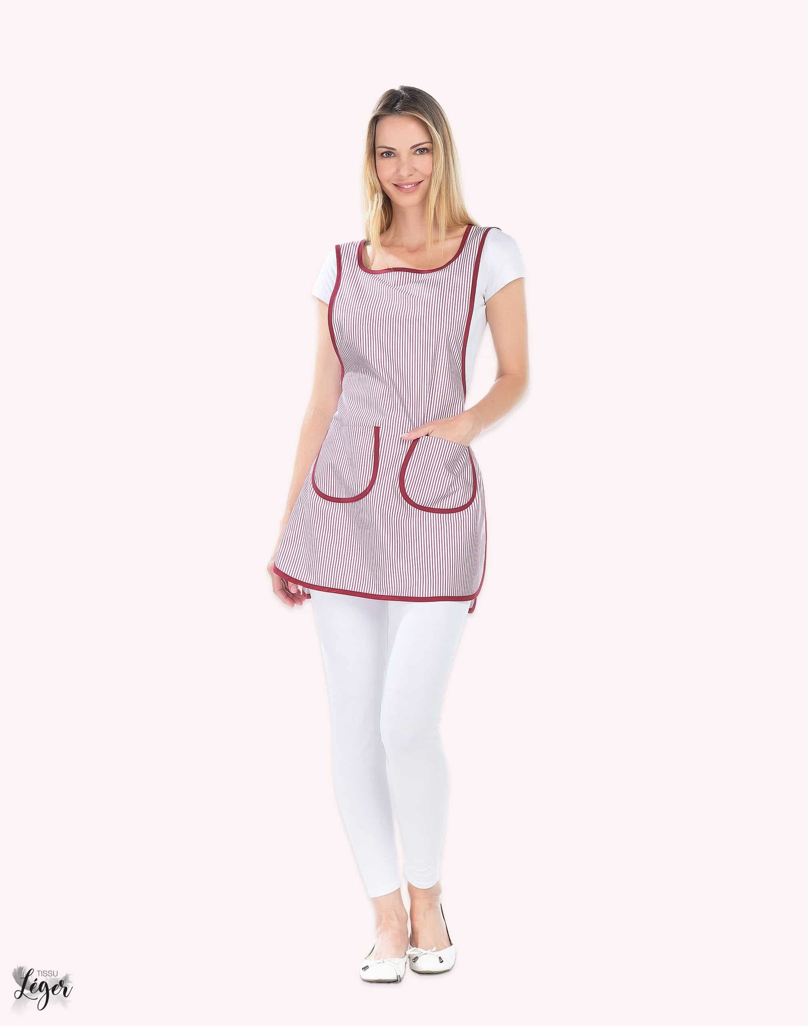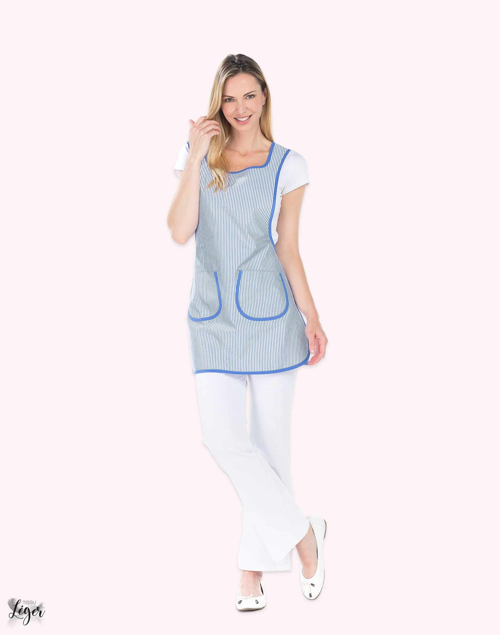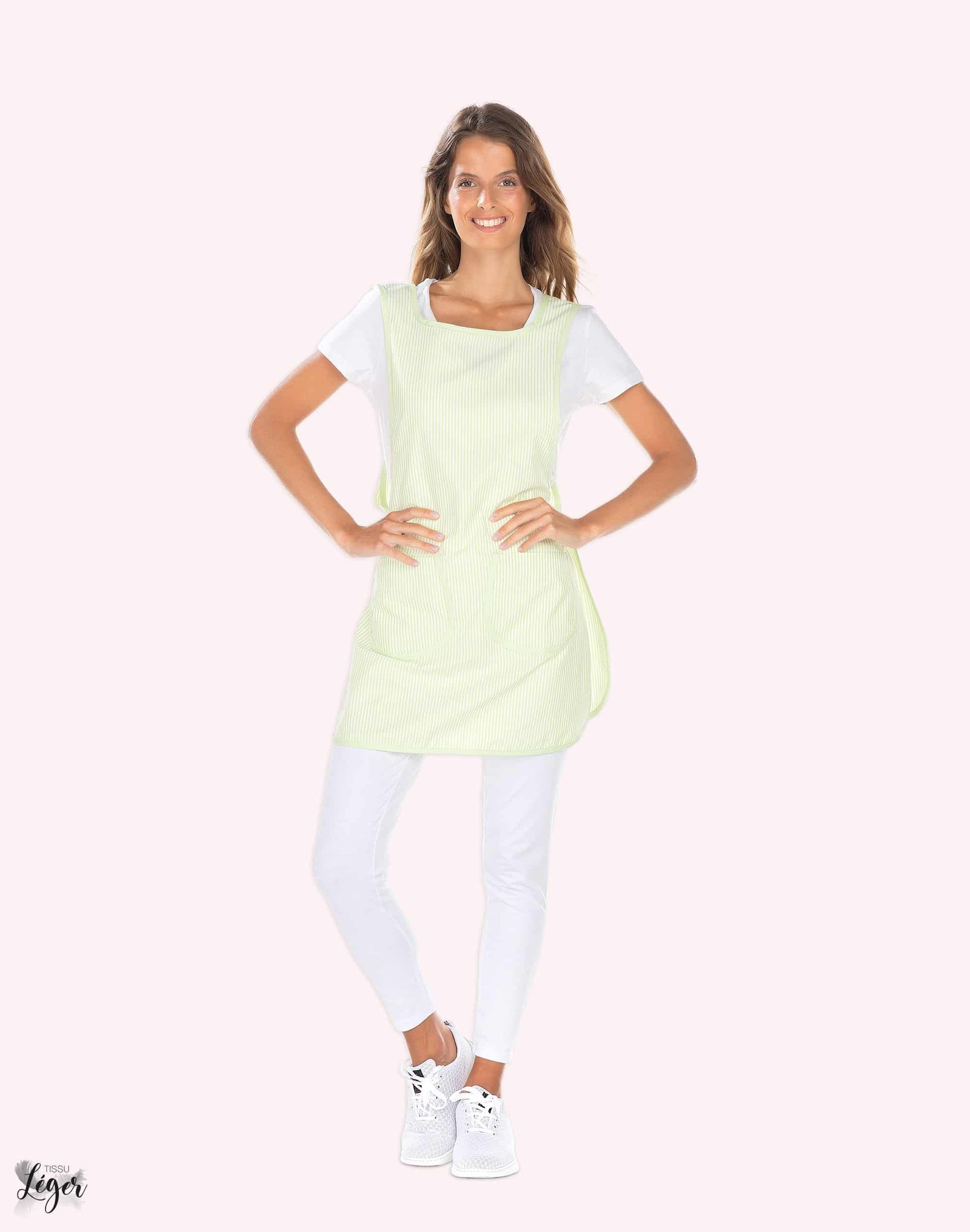 Chasuble femme, fermeture par liens, 2 poches basses, longueur 85 cm.