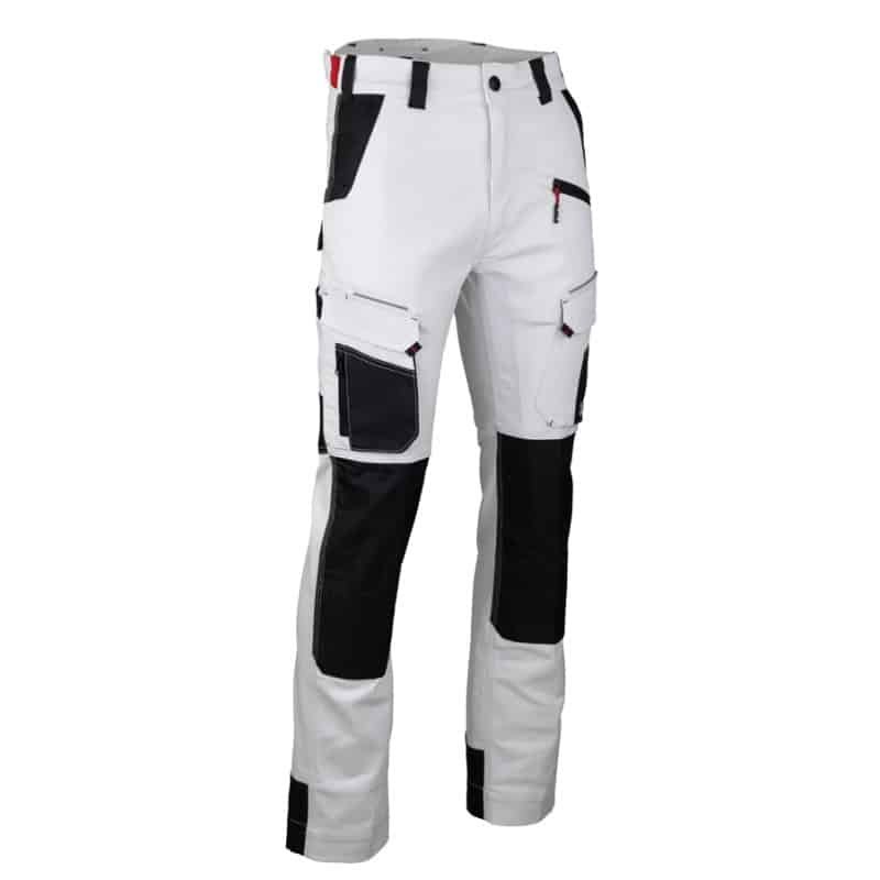 Pantalon de travail stretch bicolore avec poches genouillères. Fermeture bouton clou et braguette zippée – Ceinture resserrable sur les côtés par patte avec élastique contrastant – 4 passants + un large milieu dos – Ceinture réhaussée dans le dos – Poche main ouverture renforcée et poche ticket en Oxford – Poche zippée insérée dans découpe en biais devant – Attache porte marteau – 2 poches dos semi flottantes dont une avec rabat – 1 grande poche cuisse à rabat et soufflet avec petites poches appliquées en Oxford et insertion de passepoil rétroréfléchissant perforé – 1 poche cuisse à rabat et soufflet avec petite poche zippée appliquée en Oxford et insertion de passepoil rétroréfléchissant perforé – 1 poche mètre avec renfort Oxford – Poches genouillères double position – Renforts entrejambes devant et dos – Renforts bas de jambes au dos en Oxford avec insertion de passepoil rétroréfléchissant perforé – Triples surpiqûres.