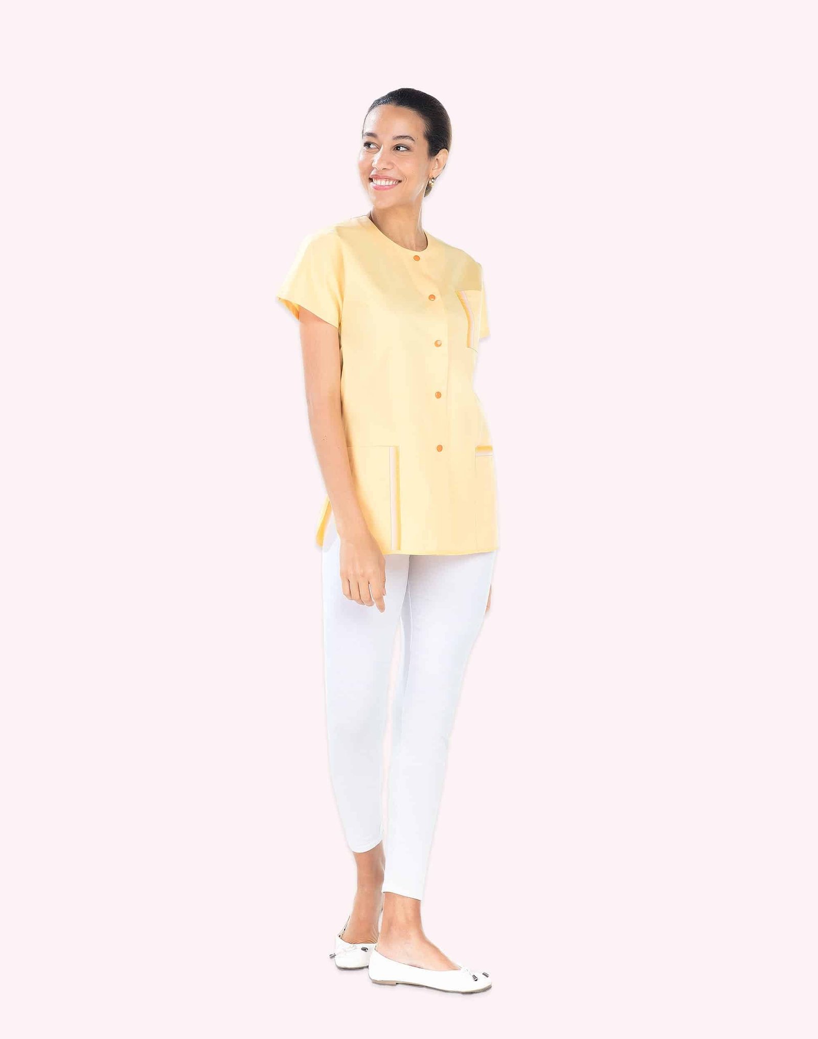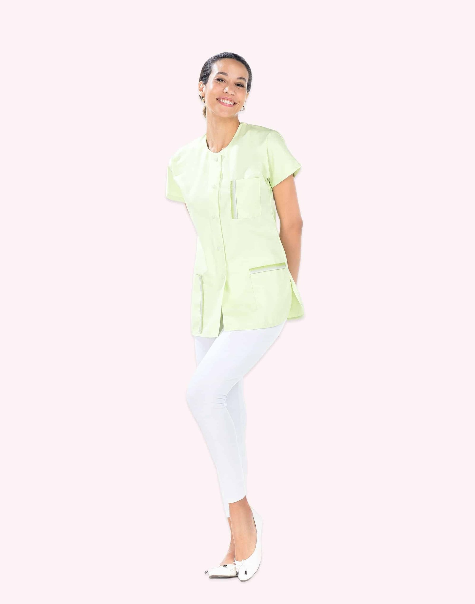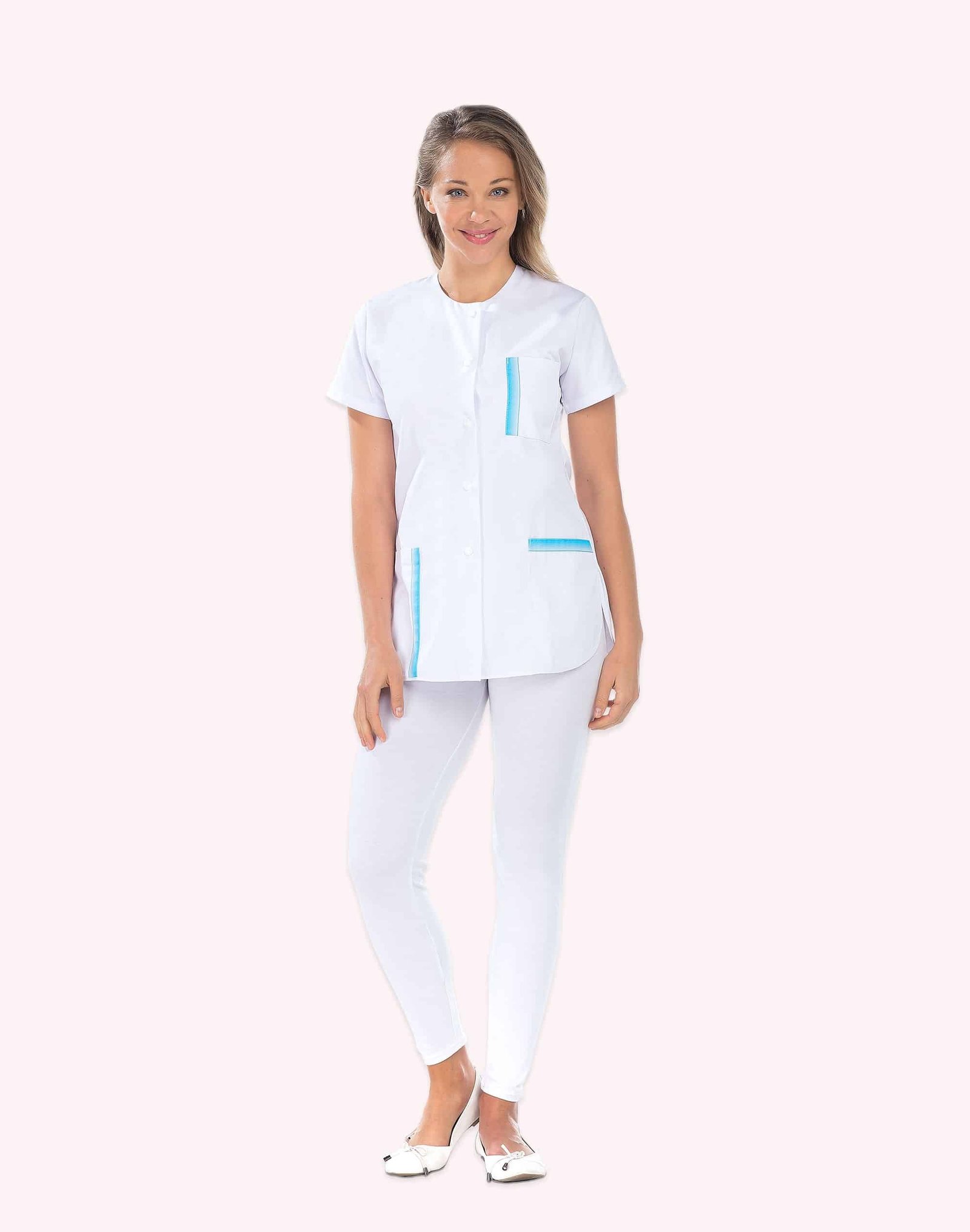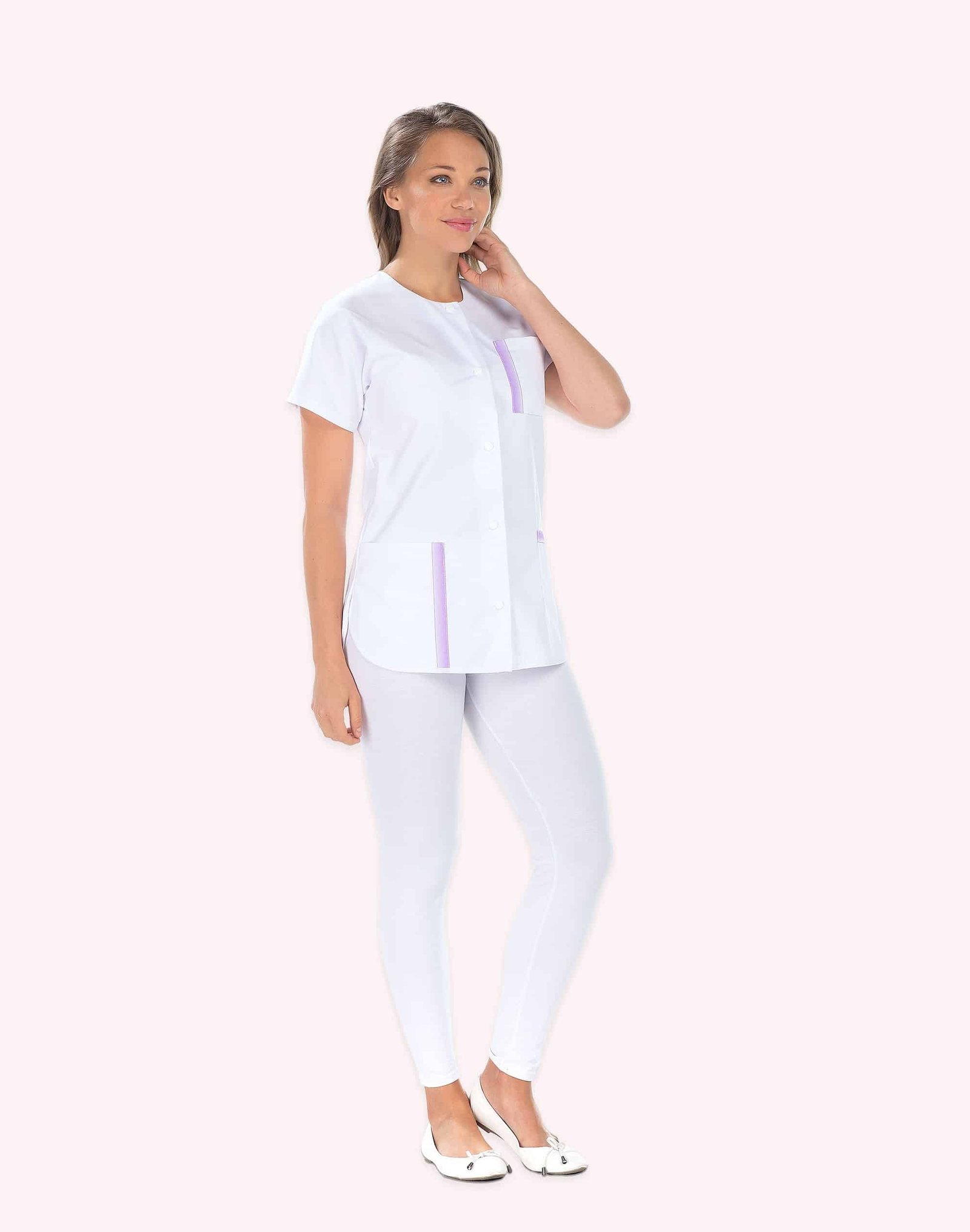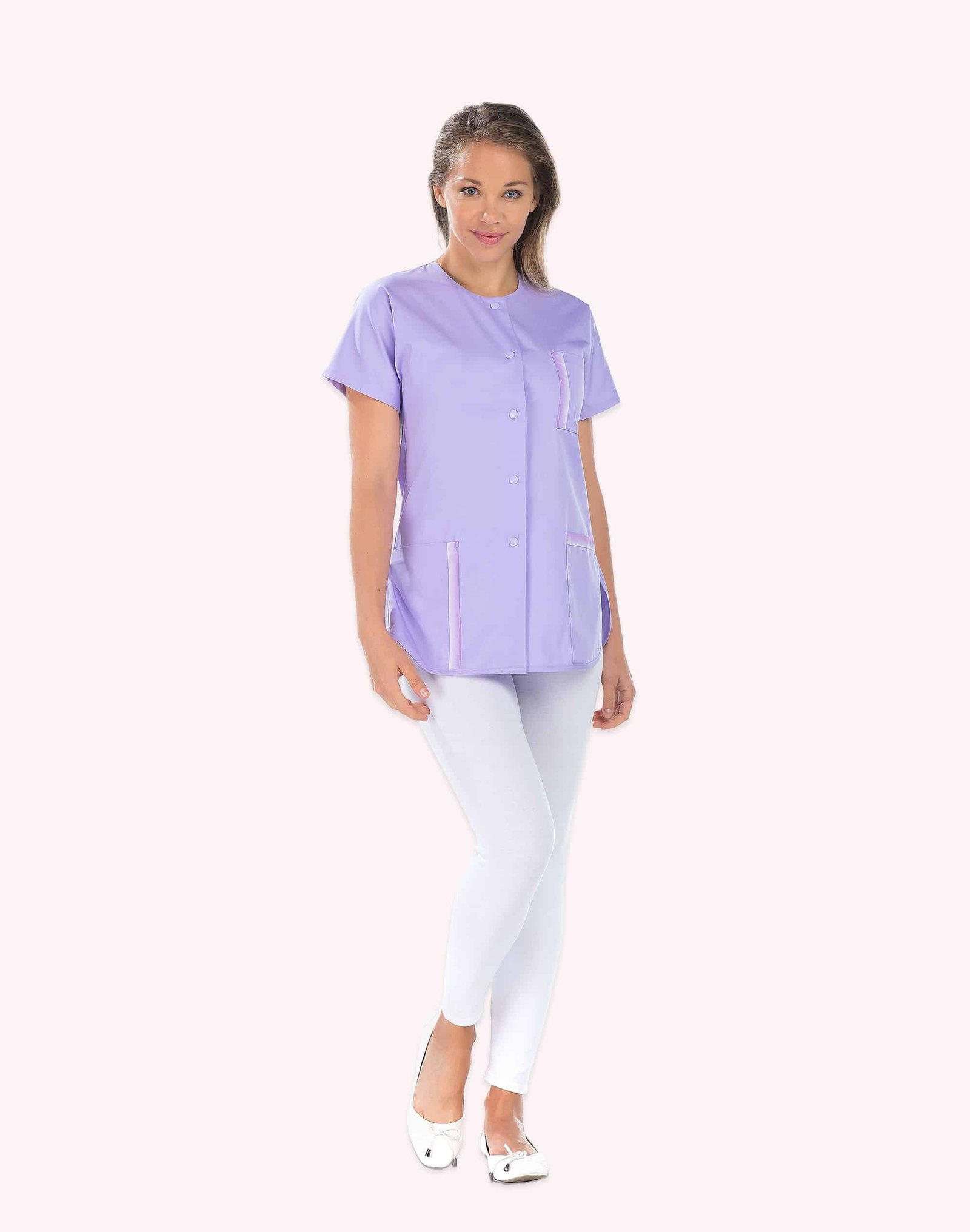 Tunique femme, manches courtes kimono, coupe liquette, fermeture par pressions, 2 poches basses, 1 poche poitrine, fentes côtés, longueur 75 cm.