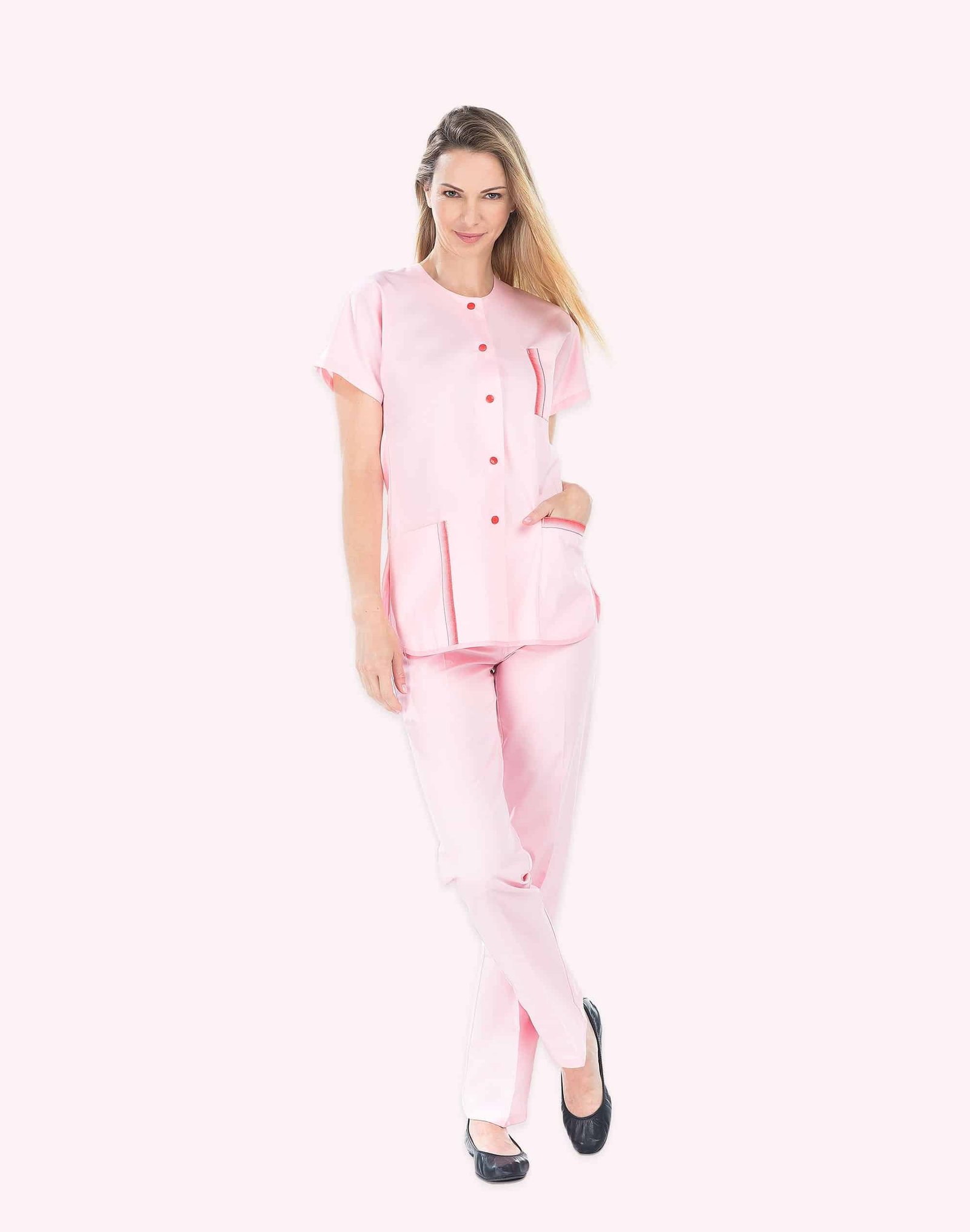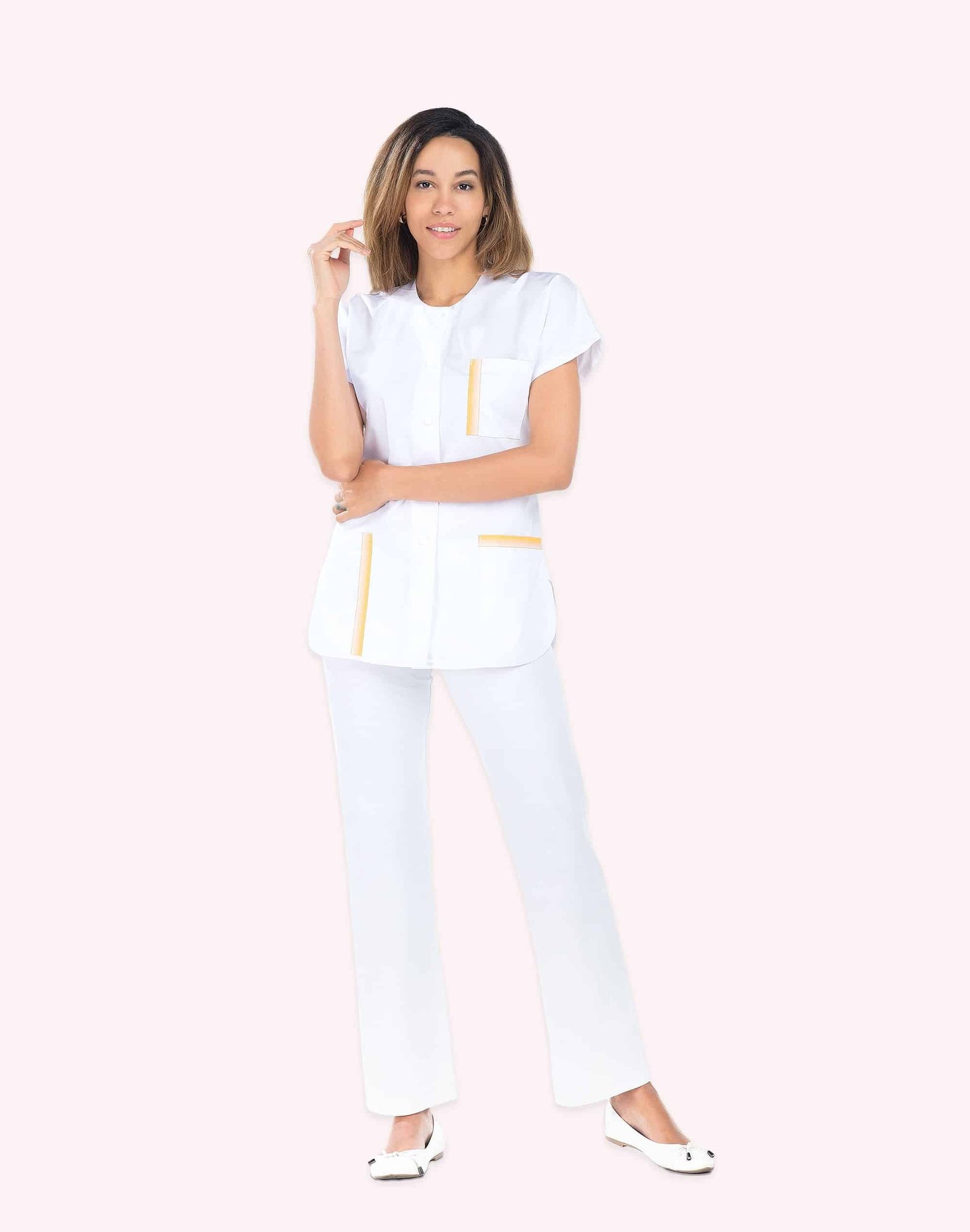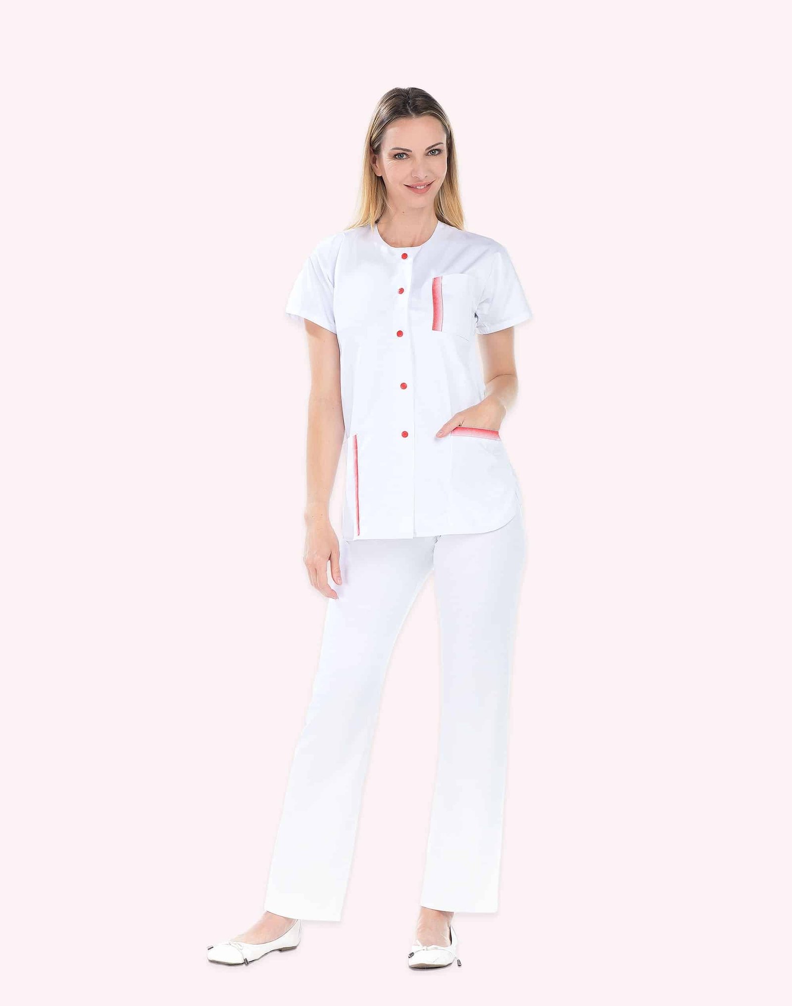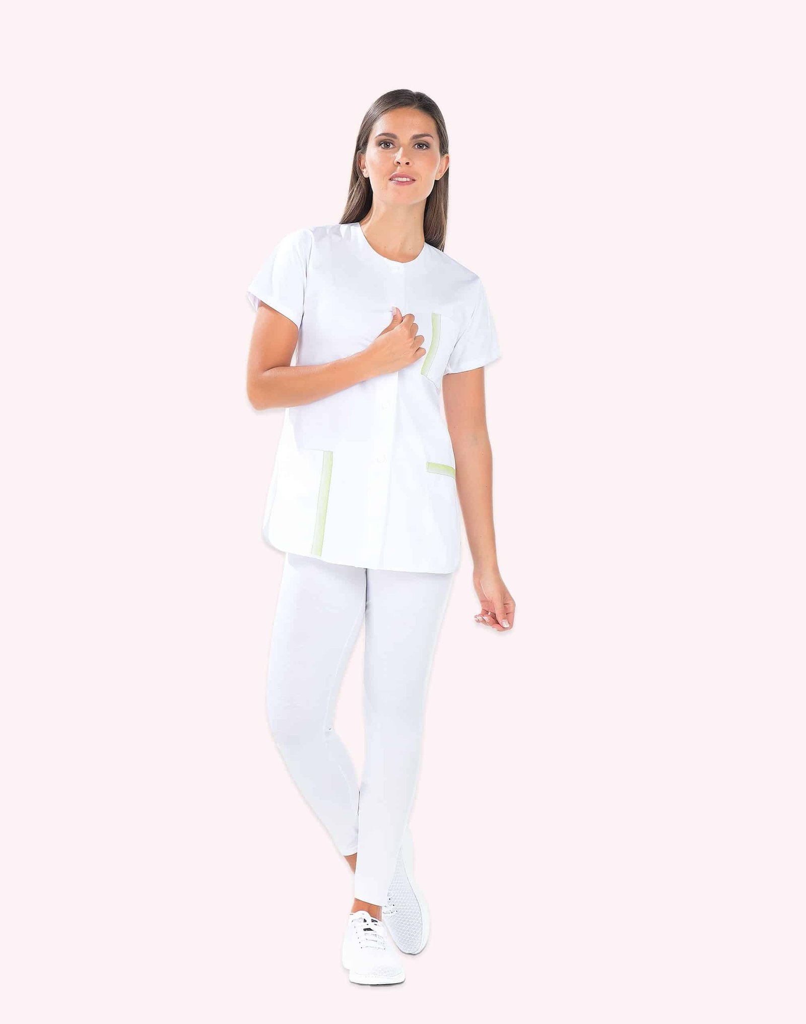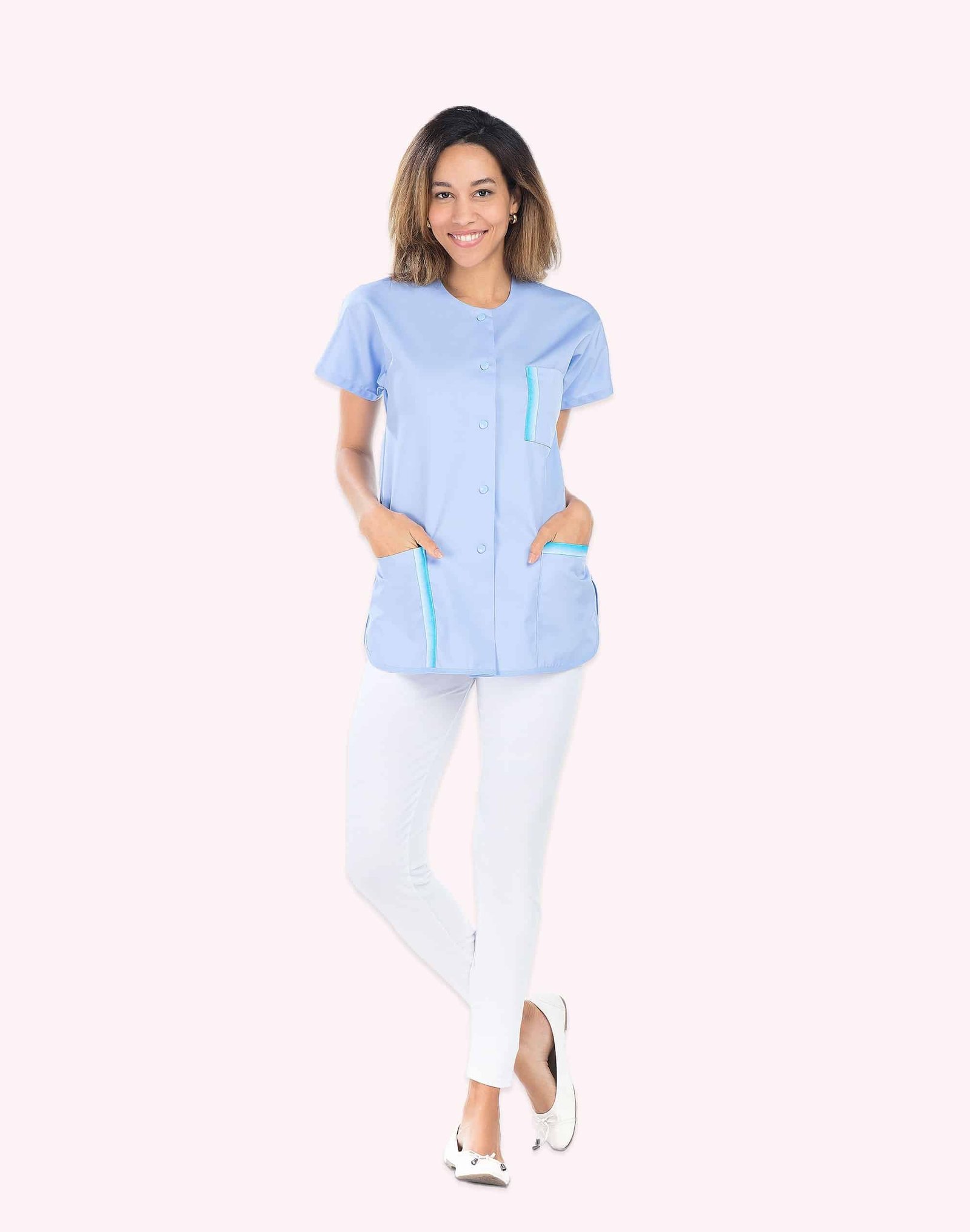 Tunique femme, manches courtes kimono, coupe liquette, fermeture par pressions, 2 poches basses, 1 poche poitrine, fentes côtés, longueur 75 cm.